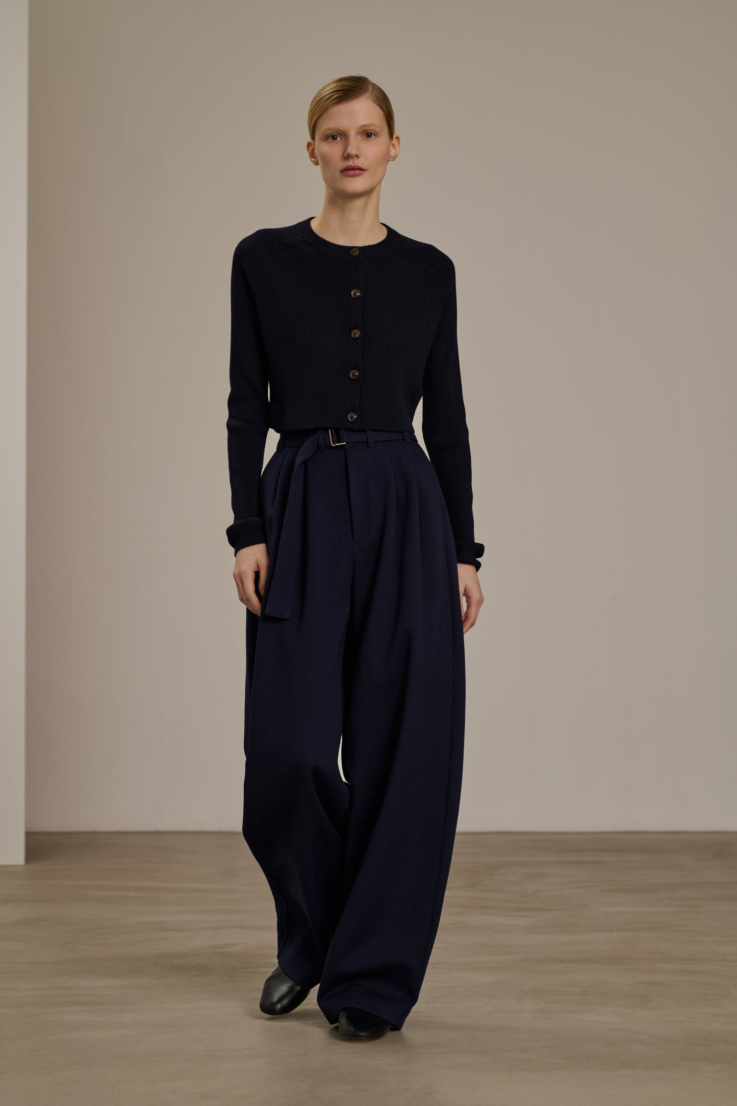 Merino wool rib knit cropped cardigan navy